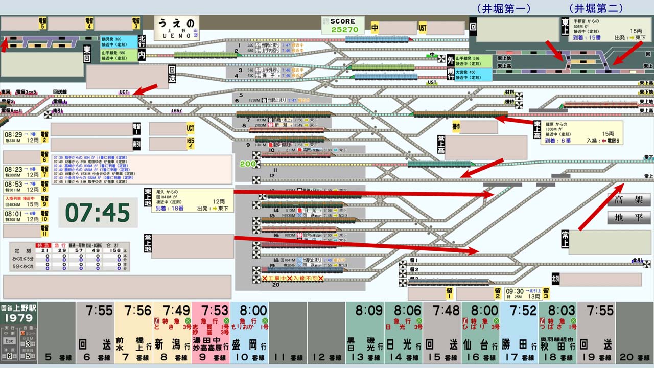 すでに東北・上越新幹線の上野駅乗り入れ工事が始まっていますが、北への玄関口として 東北奥羽常磐羽越上越信越方面各地への特急・急行列車が 昼行・夜行を含め 数多く運転されていた時代です(一部の番線と留置線が使用停止になっています)。 ゲーム実行画面では、列車は、所定の時刻どおりに次々にやってきます。 東北本線からの列車は「東上(井堀第二)」、尾久客車区からの列車は「回(井堀第一)」、常磐線からの列車は「常上」、東京駅からの列車は「東回」に、それぞれ出現します。 出現した列車に対して、入線させるホームを指示します。 「東回」以外の列車には、ホームでなく とりあえず「高架」「地平」を指示することもできます。 各場内位置は、下の画の矢印で示したあたりになります。 (名称と位置は、本ゲーム独自のもので、実際の位置や名称とは異なる場合があります。)