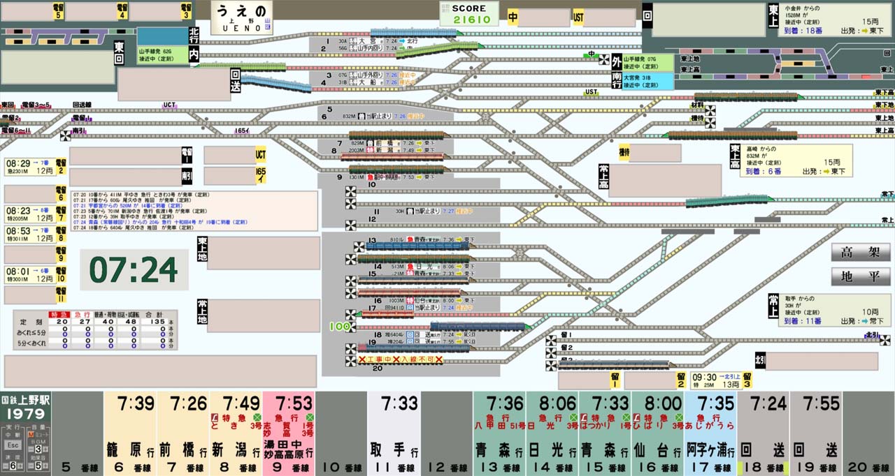 このソフトは、新幹線開業以前の国鉄時代の上野駅の1日の列車の着発をパソコン上で再現します。 所定の時刻どおりに次々にやって来る列車に 適切な入線ホームを指示して、定時運行を守りきりましょう!!! 時刻どおりに行き交う列車をただただ眺めて楽しむも良し、到着列車にホームを指示して理想の指令を追求したり遅延回復に挑戦するも良し、楽しみ方は自由です。 『国鉄上野駅1979』は1979年8月の列車ダイヤをベースにしています。 付録の「データ生成ツールv3」を使って、任意の駅・配線・ダイヤを自在に作成して楽しむことができます。(上級者向け)